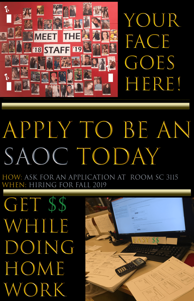 An add had to be made that promoted an aspect of campus that was worth noticing. I work at Student Activities on campus, and decided to show the type of environment that is seen at work.